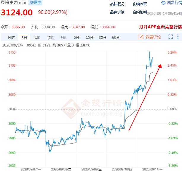 豆粕价钱最新动静:今日(9月14日)盘外,豆粕从力合约延续上行态势,目前大落近3%,报3124元。